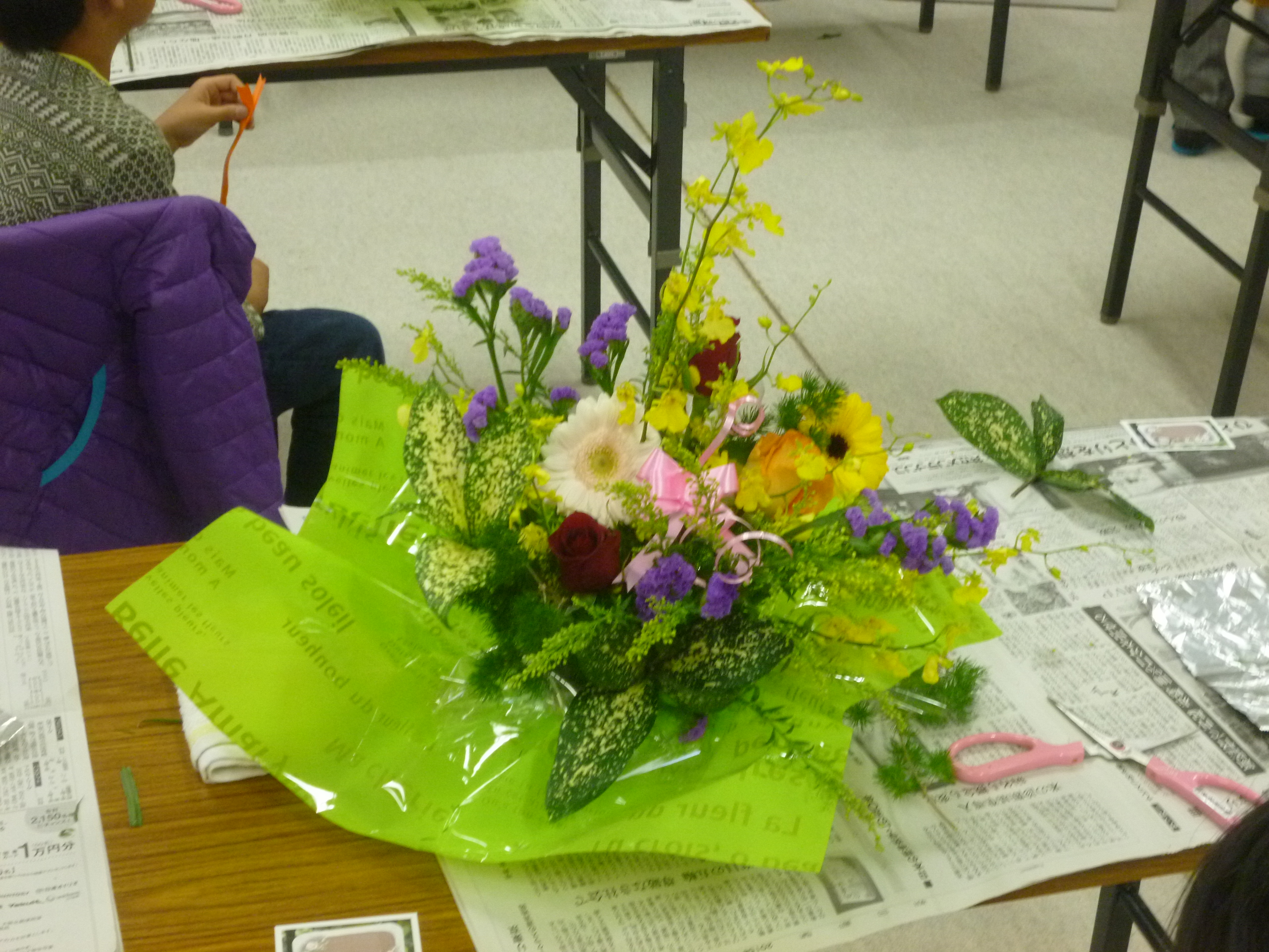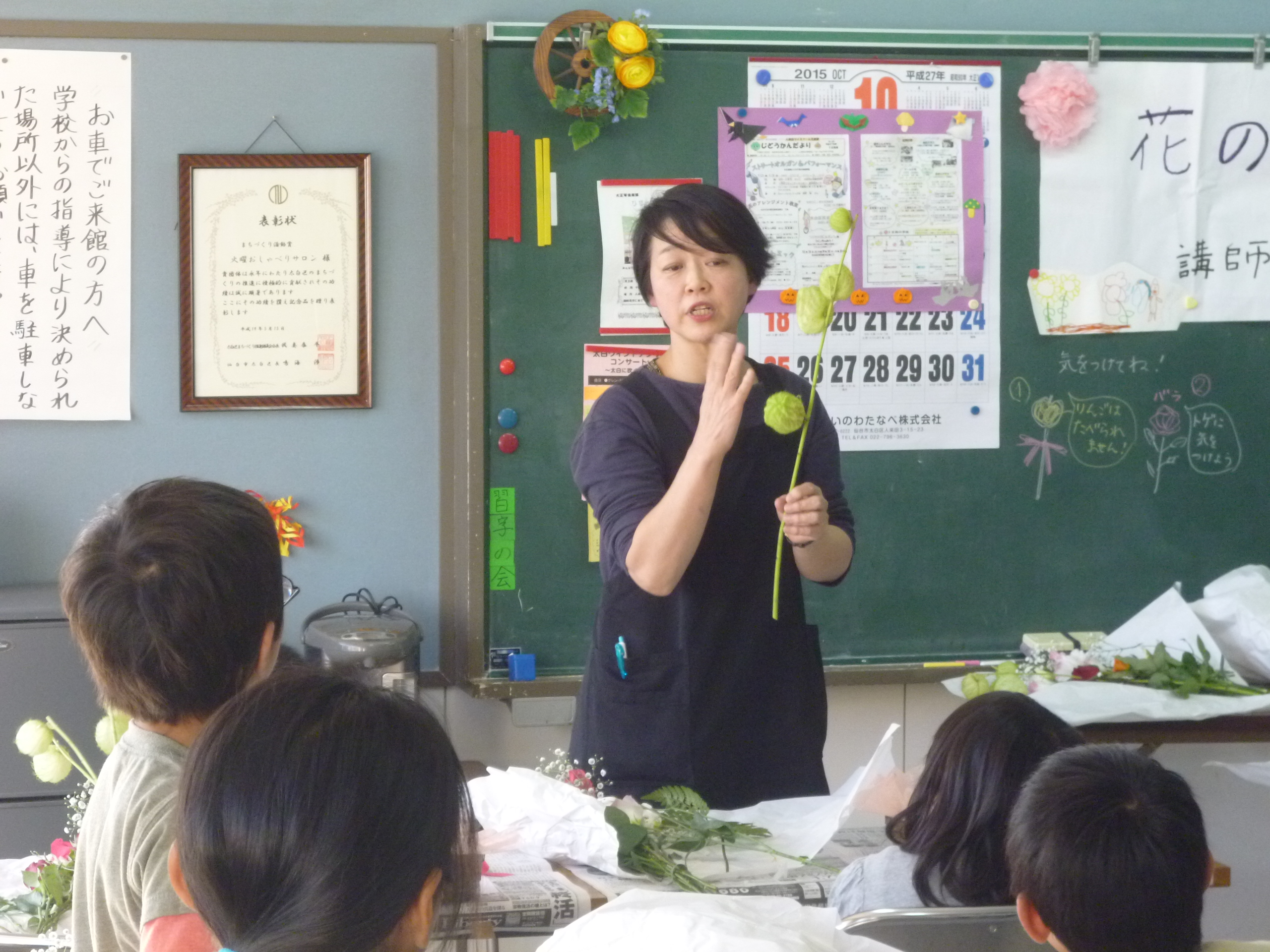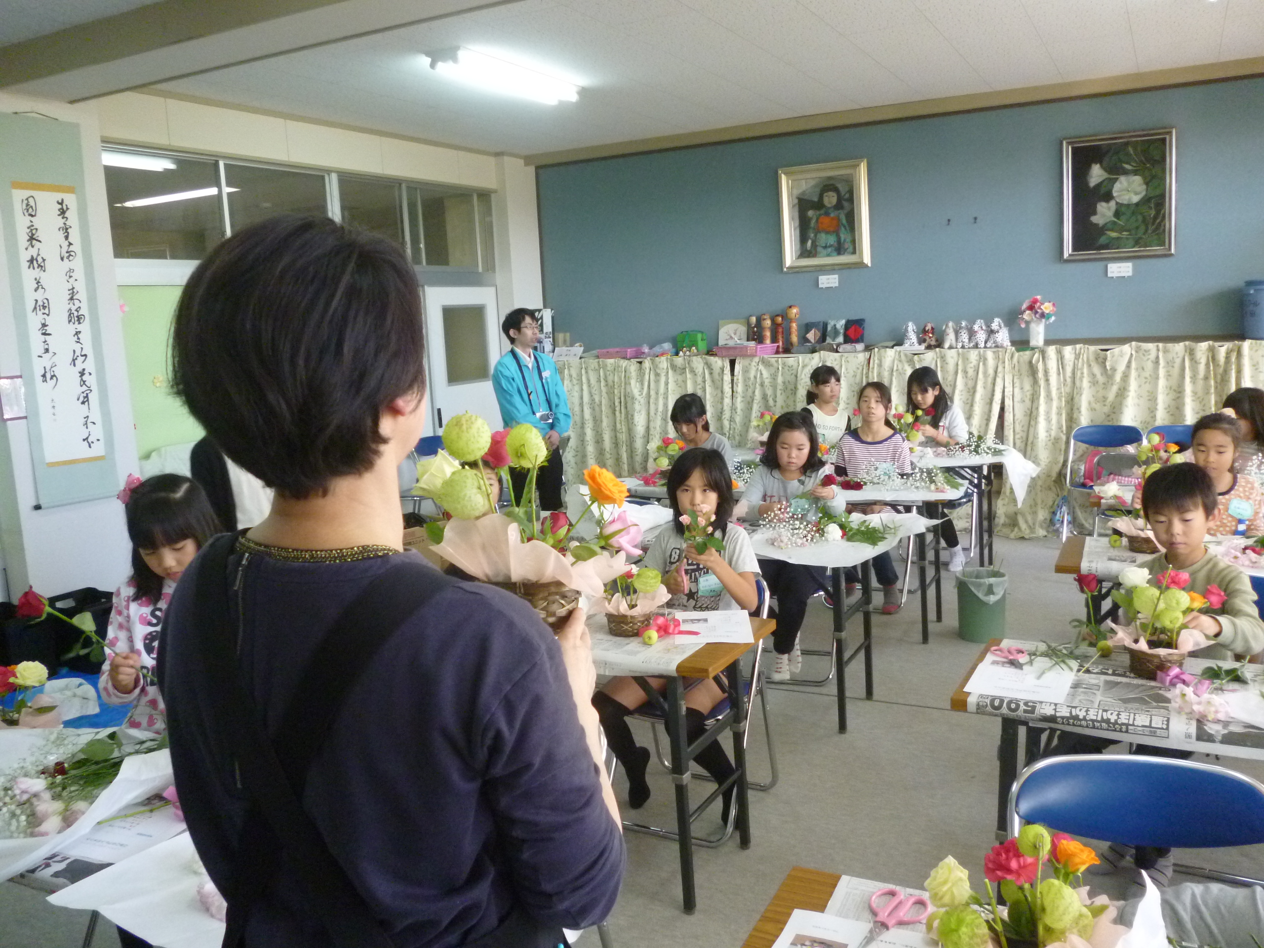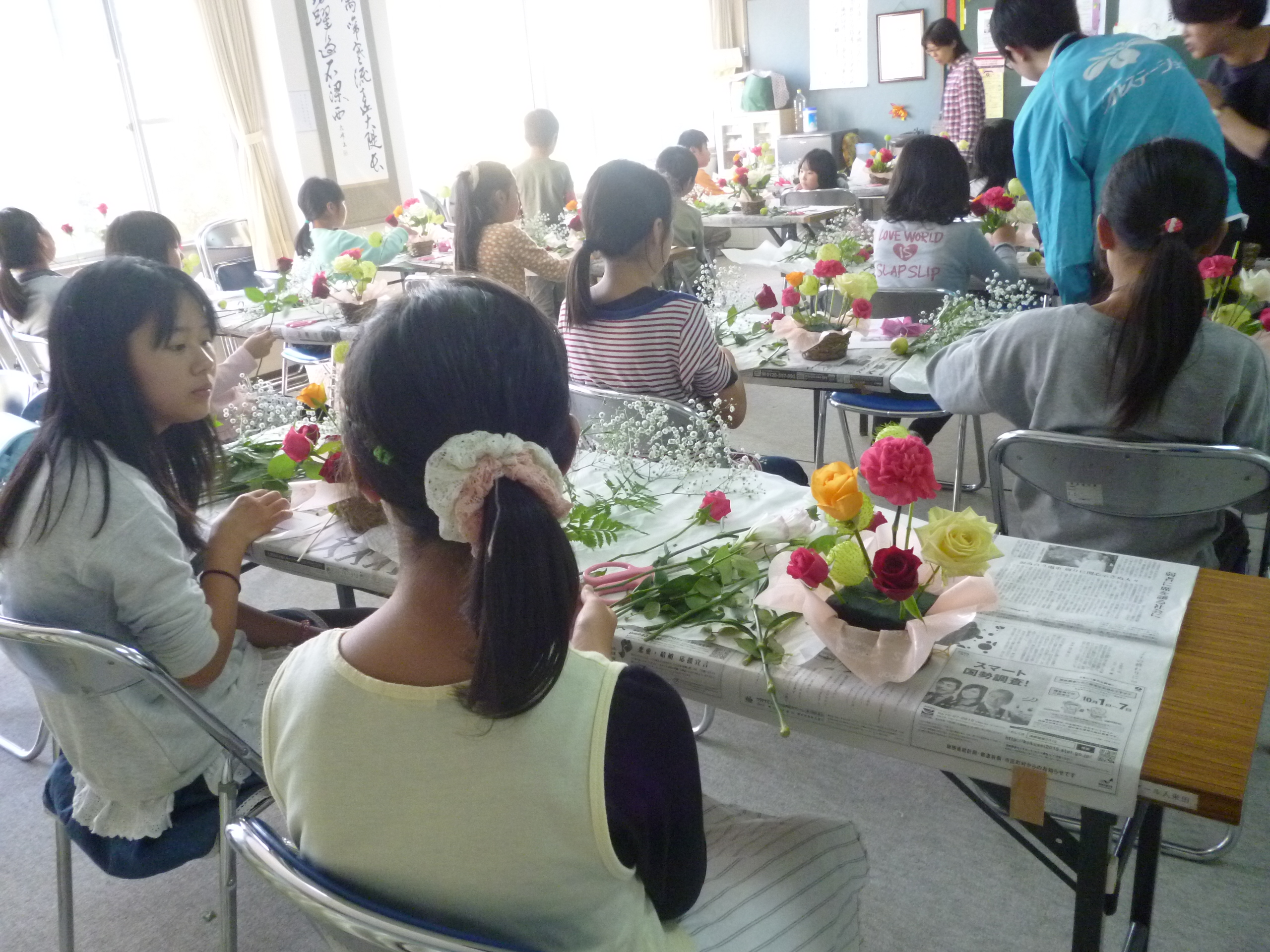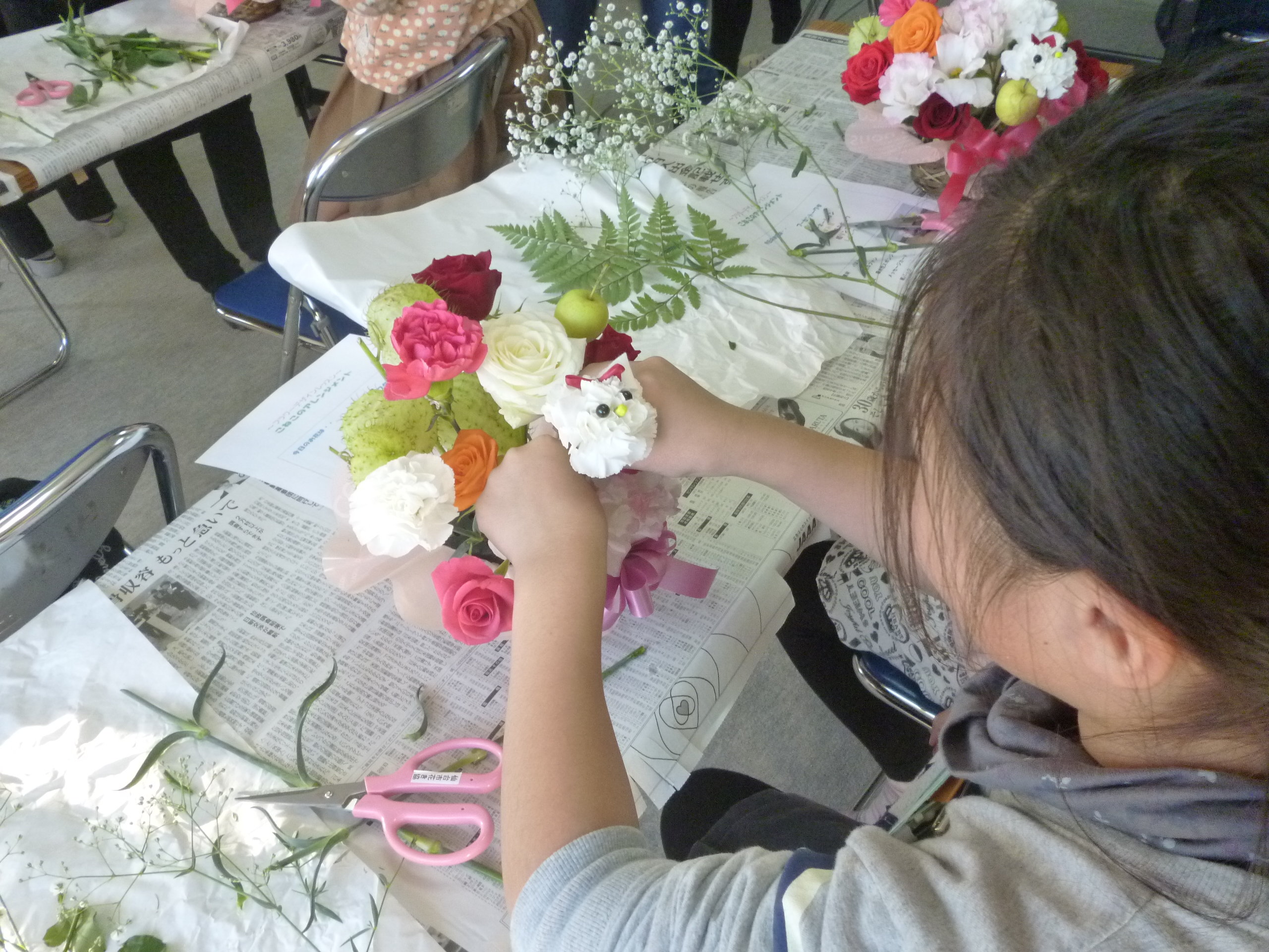 今回のフラワーアレンジメント教室には、20名の児童が参加してくれました。 使用した花は、フーセントーワタ・バラ・カーネーション・かすみ草・トルコギキョウ・姫リンゴ・レザーファンです。 担当:フローリストすずき 酒井淳子さん |